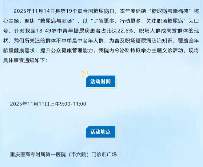 【义诊预告】我院内分泌科拟于11月11日举办联合国糖尿病日公益义诊活动